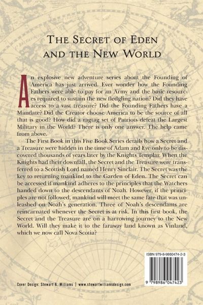An explosive new adventure series about the Founding of America has just arrived. Ever wonder how the Founding Fathers were able to pay for an Army and the basic resources required to sustain the new fledgling nation? Did they have access to a vast treasure? Did the Founding Fathers have a Mandate? Did the Creator choose America to be the source of all that is good? How did a ragtag set of Patriots defeat the Largest Military in the World? There is only one answer. The help came from above. The First Book in this Five Book Series - is called the Secret of Eden and the New World. It details how a Secret and a Treasure were passed down from the time of Adam and Eve. The Secret was the key to returning Mankind to the Garden of Eden with access to the legendary Tree of Knowledge. The Secret can be accessed if Mankind adheres to the Principles that the Watchers handed down to the descendants of Noah. However, if the Principles are not followed, Mankind will meet the same fate that was unleashed on Noah's generation. The first story begins in pre-Civil War America. Nathanial Briggs is a seemingly ordinary teenage boy. Suddenly, he is stricken with Dreams that are so realistic that he appears to be a firsthand witness to stories that had taken place as far back as the times of Adam and Eve. How is this possible? The Dreams are centered on something known as The Secret of Eden. This Secret will wipe out all of humanity if a set of rules that the Almighty has handed down are not followed, just as it happened in the time of Noah. What does any of this have to do with Nathaniel? The visions of the Dreams are centered on three souls who are the reincarnated souls of Noah's Grandchildren. They are guided by the Watchers, just as Noah was guided through the great cataclysm by the Watchers. They are always confronted by an adversary who was their cousin in Noah's time and was known as Canaan. He is guided by Satan himself. Canaan is also reincarnated every time the Secret appears. He must destroy the Treasure before his cousins find it. In Book One, the Dreams begin with two of the reincarnated souls serving as Knights Templars. The Knights find the clue that leads them to a hidden message under Solomon's Temple, which then leads them to a vault underneath the Great Sphinx in Egypt where the Secret of Eden has been hidden since the Dawn of Man. The Secret of Eden is chased through Europe for several hundred years. After the fall of the Templars on Friday the Thirteenth, 1307, the Secret is covertly moved to Scotland under the safekeeping of the Clan Sinclair. The Grandchildren appear once again as aides to Earl Henry Sinclair. They are tasked in this lifetime with fighting a harrowing battle against evil and moving the Secret of Eden to its rightful home in the New World. More specifically, the Secret of Eden is moved to New Scotland, which we now call Nova Scotia. The New World was chosen because it has been foretold for thousands of years to be the Land of the Just and was the chosen by the Creator to be the place of Salvation. ¿The story is a classic Good versus Evil Story that involves two soulmates that are reincarnated every time the Treasure is in peril. Their love story is one for the ages. They are always joined by their cousin, as well as a Seer who appears in each lifetime to guide them to the Secret of Eden. The three Guardians of the Secret of Eden are on a constant Treasure Hunt while their adversary, who is guided by Satan himself, is trying to thwart their efforts. Satan must never allow the Secret of Eden to arrive in the New World.