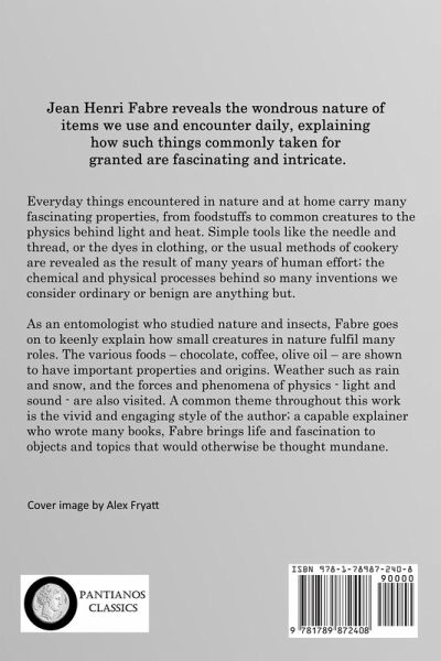Jean Henri Fabre reveals the wondrous nature of items we use and encounter daily, explaining how such things commonly taken for granted are fascinating and intricate. Everyday things encountered in nature and at home carry many fascinating properties, from foodstuffs to common creatures to the physics behind light and heat. Simple tools like the needle and thread, or the dyes in clothing, or the usual methods of cookery are revealed as the result of many years of human effort; the chemical and physical processes behind so many inventions we consider ordinary or benign are anything but. As an entomologist who studied nature and insects, Fabre goes on to keenly explain how small creatures in nature fulfil many roles. The various foods - chocolate, coffee, olive oil - are shown to have important properties and origins. Weather such as rain and snow, and the forces and phenomena of physics - light and sound - are also visited. A common theme throughout this work is the vivid and engaging style of the author; a capable explainer who wrote many books, Fabre brings life and fascination to objects and topics that would otherwise be thought mundane.