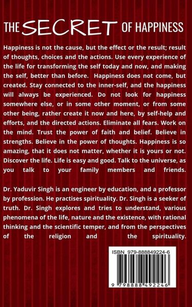 Happiness is not the cause, but the effect or the result; result of thoughts, choices and the actions. Use every experience of the life for transforming the self today and now, and making the self, better than before. Happiness does not come, but created. Stay connected to the inner-self, and the happiness will always be experienced. Do not look for happiness somewhere else, or in some other moment, or from some other being; rather create it now and here, by self-help and efforts and the directed actions. Eliminate all fears. Work on the mind. Trust the power of faith and belief. Believe in strengths. Believe in the power of thoughts. Happiness is so amazing, that it does not matter, whether it is yours or not. Discover the life. Life is easy and good. Talk to the universe, as you talk to your family members and friends, and you will find that the universe responds.