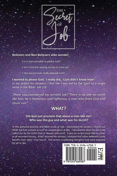 Believers and Non-Believers alike wonder: - Is it even possible to please God? - Isn't God just waiting on me to mess up? - Has anyone ever really pleased God? I wanted to please God. I really did. I just didn't know how! In my search for answers, I feel like I was led by the Spirit to a single verse in the Bible: Job 1:8. "Have you considered my servant Job? There is no one on earth like him; he is blameless and righteous, a man who fears God and shuns evil." WHAT? Did God just proclaim that about a man like me? Who was this guy and what was his secret? In this personal journey and Bible study of Job, I discovered his secrets; I found out HOW Job had arrived at such an exalted place in life. I discovered what he did to be called out by the LORD God of Heaven and Earth. It was an acclamation like no other in all recorded history. After I learned his secrets, I realized that other believers could benefit from what I had found: The secrets to pleasing Almighty God were exposed for all to see.