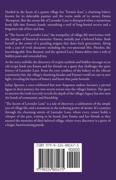 Nestled in the heart of a quaint village lies "Emma's Eats," a charming bakery known for its delectable pastries and the warm smile of its owner, Emma Thompson. But the serene life of Lavender Lane is disrupted when a mysterious book falls into Emma's hands, unearthing a trail of long-buried secrets and a forgotten tale of love and loss. In "The Secret of Lavender Lane," the tranquility of village life intertwines with the intrigue of historical mysteries. Emma, initially just a beloved baker, finds herself at the center of a puzzling enigma that dates back generations. Along with a cast of vivid characters including the ever-punctual Mrs. Fletcher, the knowledgeable Tom Bennett, and the spirited Lucy, Emma delves into a web of hidden pasts and concealed ties. As the story unfolds, the discovery of cryptic symbols and hidden messages in an old recipe book sets Emma and her friends on a quest that challenges the quiet history of Lavender Lane. From the cozy confines of the bakery to the vibrant community fair, the village's charming facades and Emma's world are cast in new light, revealing the layers of history and heart that pulse beneath. Julian Spector, a once-celebrated but now forgotten author, becomes a pivotal figure in their journey, his own secrets woven into the village's history. The quest to uncover the truth not only reveals the depth of the village's legacy but also tests the bonds of community and friendship. "The Secret of Lavender Lane" is a tale of discovery, a celebration of the simple joys of village life, and a testament to the enduring power of stories. It's a journey through the charming streets of Lavender Lane, where every corner holds a whisper of the past, waiting to be heard. Join Emma and her friends as they unravel the mysteries of their beloved village, where every discovery is a piece of a larger, heartwarming puzzle.