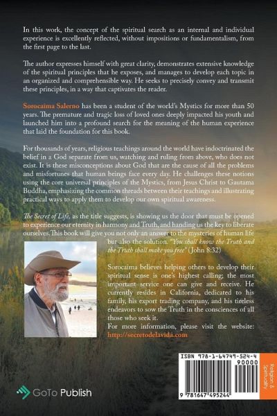 In this work, the concept of the spiritual search as an internal and individual experience is excellently reflected, without impositions or fundamentalism, from the first page to the last. The author expresses himself with great clarity, demonstrates extensive knowledge of the spiritual principles that he exposes, and manages to develop each topic in an organized and comprehensible way. He seeks to precisely convey and transmit these principles, in a way that captivates the reader. Sorocaima Salerno has been a student of the world's Mystics for more than 50 years. The premature and tragic loss of loved ones deeply impacted his youth and launched him into a profound search for the meaning of the human experience that laid the foundation for this book. For thousands of years, religious teachings around the world have indoctrinated the belief in a God separate from us, watching and ruling from above, who does not exist. It is these misconceptions about God that are the cause of all the problems and misfortunes that human beings face every day. He challenges these notions using the core universal principles of the Mystics, from Jesus Christ to Gautama Buddha, emphasizing the common threads between their teachings and illustrating practical ways to apply them to develop our own spiritual awareness. The Secret of Life, as the title suggests, is showing us the door that must be opened to experience our eternity in harmony and Truth, and handing us the key to liberate ourselves. This book will give you not only an answer to the mysteries of human life but also the solution. "You shall know the Truth and the Truth shall make you free" (John 8:32)