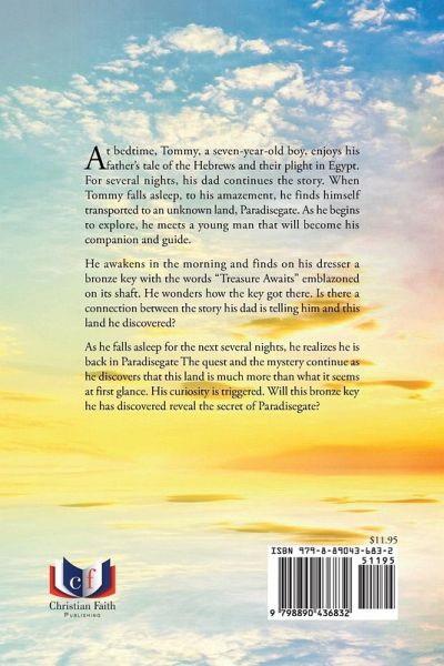 At bedtime, Tommy, a seven-year-old boy, enjoys his father's tale of the Hebrews and their plight in Egypt. For several nights, his dad continues the story. When Tommy falls asleep, to his amazement, he finds himself transported to an unknown land, Paradisegate. As he begins to explore, he meets a young man that will become his companion and guide. He awakens in the morning and finds on his dresser a bronze key with the words "Treasure Awaits" emblazoned on its shaft. He wonders how the key got there. Is there a connection between the story his dad is telling him and this land he discovered? As he falls asleep for the next several nights, he realizes he is back in Paradisegate The quest and the mystery continue as he discovers that this land is much more than what it seems at first glance. His curiosity is triggered. Will this bronze key he has discovered reveal the secret of Paradisegate?