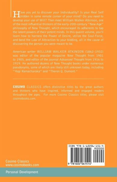 Have you yet to discover your Individuality? Is your Real Self hidden in some remote corner of your mind? Do you need to develop your use of Will? Then meet William Walker Atkinson, one of the most influential thinkers of the early-20th-century "New Age" philosophy of New Thought, which encouraged its adherents to tap the latent powers of their potent minds. In this quaint volume, you'll learn how to harness the Power of Desire, utilize the Soul-Force, and bend the Law of Attraction to your bidding, all in the cause of discovering the person you were meant to be. American writer WILLIAM WALKER ATKINSON (1862-1932) was editor of the popular magazine New Thought from 1901 to 1905, and editor of the journal Advanced Thought from 1916 to 1919. He authored dozens of New Thought books under numerous pseudonyms, some of which are likely still unknown today, including "Yogi Ramacharaka" and "Theron Q. Dumont."
