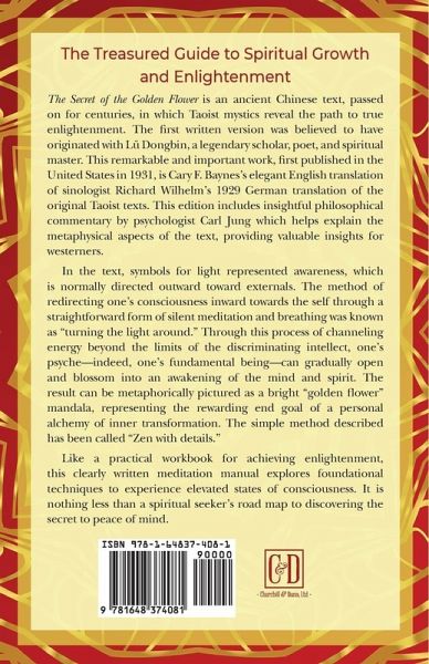 The Treasured Guide to Spiritual Growth and Enlightenment The Secret of the Golden Flower is an ancient Chinese text, passed on for centuries, in which Taoist mystics reveal the path to true enlightenment. The first written version was believed to have originated with Lü Dongbin, a legendary scholar, poet, and spiritual master. This remarkable and important work, first published in the United States in 1931, is Cary F. Baynes's elegant English translation of sinologist Richard Wilhelm's 1929 German translation of the original Taoist texts. This edition includes insightful philosophical commentary by psychologist Carl Jung which helps explain the metaphysical aspects of the text, providing valuable insights for westerners. In the text, symbols for light represented awareness, which is normally directed outward toward externals. The method of redirecting one's consciousness inward towards the self through a straightforward form of silent meditation and breathing was known as "turning the light around." Through this process of channeling energy beyond the limits of the discriminating intellect, one's psyche-indeed, one's fundamental being-can gradually open and blossom into an awakening of the mind and spirit. The result can be metaphorically pictured as a bright "golden flower" mandala, representing the rewarding end goal of a personal alchemy of inner transformation. The simple method described has been called "Zen with details." Like a practical workbook for achieving enlightenment, this clearly written meditation manual explores foundational techniques to experience elevated states of consciousness. It is nothing less than a spiritual seeker's road map to discovering the secret to peace of mind. This book is also available from Churchill & Dunn in hardcover (ISBN 1648374077).