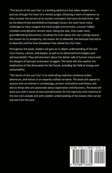 "The Secret of the Lost City" is a thrilling adventure that takes readers on a journey through the heart of a remote jungle, following a team of explorers as they uncover the secrets of an ancient civilization that once thrived there. Led by the determined and skilled archaeologist Susan, the team faces many challenges as they navigate the harsh jungle environment, uncover hidden chambers and decipher ancient texts. Along the way, they make many groundbreaking discoveries, including the truth about the city's energy source, the reason for its prosperity, the reason for its downfall, the betrayal that led to its downfall and the final showdown that sealed the city's fate. Throughout the book, readers will gain an in-depth understanding of the lost city's history, culture, and people, as well as its advanced technologies and spiritual beliefs. They will also learn about the darker side of human nature and the dangers of betrayal and power struggles. The book will also explore the implications of the discoveries for the future, including the field of energy and sustainability. "The Secret of the Lost City" is an enthralling read that combines action, adventure, and history in an expertly crafted narrative. The book will appeal to anyone with an interest in archaeology, ancient civilizations and history, but also to those who are passionate about exploration and discovery. The book will leave you with a sense of awe and admiration for the ingenuity and creativity of the lost city's people and with a better understanding of the lessons that can be learned from the past.