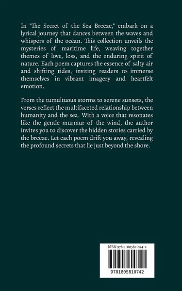 In "The Secret of the Sea Breeze," embark on a lyrical journey that dances between the waves and whispers of the ocean. This collection unveils the mysteries of maritime life, weaving together themes of love, loss, and the enduring spirit of nature. Each poem captures the essence of salty air and shifting tides, inviting readers to immerse themselves in vibrant imagery and heartfelt emotion. From the tumultuous storms to serene sunsets, the verses reflect the multifaceted relationship between humanity and the sea. With a voice that resonates like the gentle murmur of the wind, the author invites you to discover the hidden stories carried by the breeze. Let each poem drift you away, revealing the profound secrets that lie just beyond the shore.