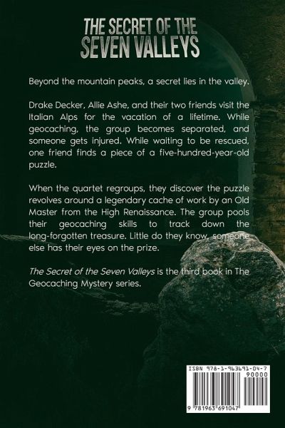 Beyond the mountain peaks, a secret lies in the valley. Drake Decker, Allie Ashe, and their two friends visit the Italian Alps for the vacation of a lifetime. While geocaching, the group becomes separated, and someone gets injured. While waiting to be rescued, one friend finds a piece of a five-hundred-year-old puzzle. When the quartet regroups, they discover the puzzle revolves around a legendary cache of work by an Old Master from the High Renaissance. The group pools their geocaching skills to track down the long-forgotten treasure. Little do they know, someone else has their eyes on the prize. The Secret of the Seven Valleys is the third book in The Geocaching Mystery series.