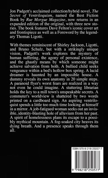 Jon Padgett's acclaimed collection/hybrid novel, The Secret of Ventriloquism, named the Best Fiction Book by Rue Morgue Magazine, now returns in an expanded edition of the original, with three new stories. The book features Dave Felton's iconic cover art and frontispiece as well as a Foreword by the legendary Thomas Ligotti. With themes reminiscent of Shirley Jackson, Ligotti, and Bruno Schulz, but with a strikingly unique vision, Padgett's work explores the mystery of human suffering, the agony of personal existence, and the ghastly means by which someone might achieve salvation from both. A bullied child seeks vengeance within a bed's hollow box spring. A lucid dreamer is haunted by an impossible house. A dummy reveals its own anatomy in 20 simple steps. A paranoid flyer's worst fears are realized in a way not even he could imagine. A stuttering librarian holds the key to a mill town's unspeakable secrets. A commuter's worldview is shattered by two words printed on a cardboard sign. An aspiring ventriloquist spends a little too much time looking at himself in a mirror. A job-fatigued woman seeks out an invisible, identity-blasting hole of alluvium from her past. A spirit of homelessness plans its escape to a possibly mythical mountain. A fog-soaked city heaves its dying breath. And a presence speaks through them all.
