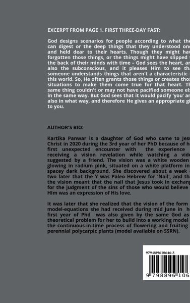EXCERPT FROM PAGE 1. FIRST THREE-DAY FAST: God designs scenarios for people according to what they can digest or the deep things that they understood once and held dear to their hearts. Though they might have forgotten those things, or the things might have slipped to the back of their minds with time - God sees the heart, and also the subconscious, and it pleases Him to see that someone understands things that aren't a characteristic of this world. So, He often grants those things or creates those situations to make them come true for that heart. The same thing couldn't or may not have pacified someone else in the same way. But God sees that it would pacify 'you' and also in what way, and therefore He gives an appropriate gift to you.