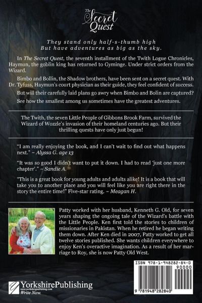 Patty worked with her husband, Kenneth G. Old, for seven years shaping the ongoing tale of the Wizard's battle with the Little People. Ken first told the stories to children of missionaries in Pakistan. When he retired he began writing them down. After Ken died in 2007, Patty worked to get all twelve stories published. She wants children everywhere to enjoy Ken's overactive imagination. As a result of her marriage to Roy, she is now Patty Old West.