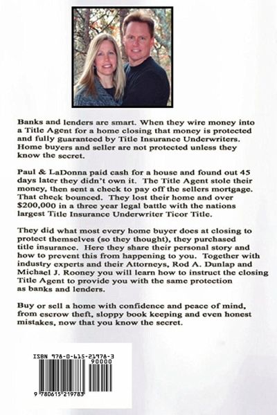 Planning to buy or sell a home? Then you need to know how to avoid losing your money and home at the closing table. This problem is national in scope, and growing each year. Title Agents who steal your money and don't payoff the sellers mortgage can rob you of your money and your future. Paul & LaDonna lost their home and over $200,000 in a 3 year legal battle with the largest title insurance underwriter, Ticor Title. Together with industry experts and their Attorneys they share their research findings and reveal the secret on how consumers can receive the same protection that banks and lender receive for their money. "THE SECRET REVEALED" provides specific actions buyers and sellers need to take to protect their money and their home at closing against escrow theft, sloppy book keeping and purposeful mishandling of your money.