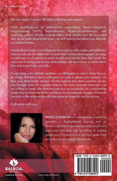Are you ready for a new life filled with love and respect? With qualifications in relationship counselling, Neuro-Linguistic Programming (NLP), hypnotherapy, hypno-psychotherapy, and coaching, author Mirella DeBoni offers solid insight into the how and why of our individual behaviour-as well as how that behaviour impacts our relationships. Mirella draws on her years of experience working with couples and addresses what people can do differently to make their relationship happier. By using a combination of communication models and simple steps that create the outcome of lasting and loving relationships, she shows how to invite more love and respect into your life. It only takes a few definite qualities-a willingness to want to learn how to do things differently and a willingness to want to please your partner-to turn your relationship around. Mirella explains how these qualities can see you through from the toughest times to the most intimate memories you are willing to create. She demonstrates that accountability in a relationship means that you have the ability and the power to make any changes. Whatever you take to the relationship will determine its longevity and its success. It all starts with you.