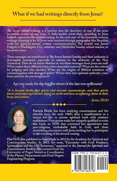What if we had writings directly from Jesus? The Secret Second Coming is a journey into the discovery of one of the most incredible events of our time. A little-known event that, according to Jesus himself, represents his second coming. In the early part of the twentieth century, writings claiming to be by Jesus were received through psicografica (Brazilian for spirit-to-mortal written communications). The mortal was James Padgett, a Washington D.C. attorney and Methodist Sunday school teacher, in his senior years. These messages are introduced in The Secret Second Coming and their authority is thoroughly examined, especially in relation to the authority of the New Testament. How do we know whether or not these messages from Jesus are real? What makes them different from other channeled material? What are the criteria for judging and who decides? What are the origins of Biblical resistance to communication with deceased spirits?Where does true spiritual authority come from and how do you recognize it? In addition to answering these questions, The Secret Second Coming reveals:*convincing evidence of life after death by scientists and lawyers,*that profound knowledge can come from paranormal states of consciousness,*that we can communicate with our loved ones who have passed, and*that we can establish a personal relationship with a loving God. In The Secret Second Coming, the author combines extensive academic research with personal stories of the four events which uniquely qualify her to write this book: an NDE that converted her agnosticism into non-religious, unshakable faith in God, and three profound encounters with Jesus inviting her to participate in the revealing of his second coming. "It is beyond doubt that spirits and mortals communicate, and that spirits know just what mortals are doing on earth and how to influence them in their loves and actions." -Jesus, III:83