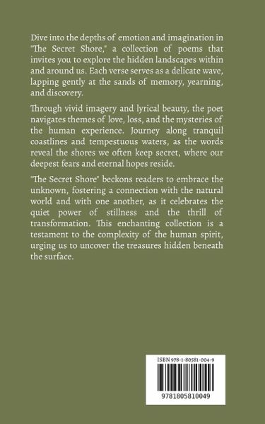 Dive into the depths of emotion and imagination in "The Secret Shore," a collection of poems that invites you to explore the hidden landscapes within and around us. Each verse serves as a delicate wave, lapping gently at the sands of memory, yearning, and discovery. Through vivid imagery and lyrical beauty, the poet navigates themes of love, loss, and the mysteries of the human experience. Journey along tranquil coastlines and tempestuous waters, as the words reveal the shores we often keep secret, where our deepest fears and eternal hopes reside. "The Secret Shore" beckons readers to embrace the unknown, fostering a connection with the natural world and with one another, as it celebrates the quiet power of stillness and the thrill of transformation. This enchanting collection is a testament to the complexity of the human spirit, urging us to uncover the treasures hidden beneath the surface.