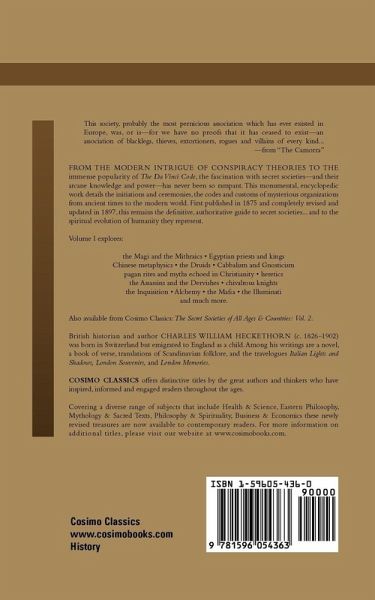 This society, probably the most pernicious association which has ever existed in Europe, was, or is-for we have no proofs that it has ceased to exist-an association of blacklegs, thieves, extortioners, rogues and villains of every kind... -from "The Camorra" From the modern intrigue of conspiracy theories to the immense popularity of The Da Vinci Code, the fascination with secret societies-and their arcane knowledge and power-has never been so rampant. This monumental, encyclopedic work details the initiations and ceremonies, the codes and customs of mysterious organizations from ancient times to the modern world. First published in 1875 and completely revised and updated in 1897, this remains the definitive, authoritative guide to secret societies... and to the spiritual evolution of humanity they represent. Volume I explores: the Magi and the Mithraics . Egyptian priests and kings Chinese metaphysics . the Druids . Cabbalism and Gnosticism pagan rites and myths echoed in Christianity . heretics the Assassins and the Dervishes . chivalrous knights the Inquisition . Alchemy . the Mafia . the Illuminati and much more. Also available from Cosimo Classics: The Secret Societies of All Ages & Countries: Vol. 2. British historian and author CHARLES WILLIAM HECKETHORN (c. 1826-1902) was born in Switzerland but emigrated to England as a child. Among his writings are a novel, a book of verse, translations of Scandinavian folklore, and the travelogues Italian Lights and Shadows, London Souvenirs, and London Memories.