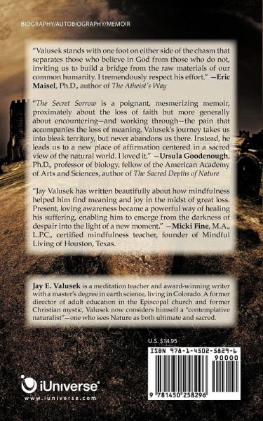 "Valusek stands with one foot on either side of the chasm that separates those who believe in God from those who do not, inviting us to build a bridge from the raw materials of our common humanity. I tremendously respect his effort." -Eric Maisel, Ph.D., author of The Atheist's Way "The Secret Sorrow is a poignant, mesmerizing memoir, proximately about the loss of faith but more generally about encountering-and working through-the pain that accompanies the loss of meaning. Valusek's journey takes us into bleak territory, but never abandons us there. Instead, he leads us to a new place of affirmation centered in a sacred view of the natural world. I loved it." -Ursula Goodenough, Ph.D., professor of biology, fellow of the American Academy of Arts and Sciences, author of The Sacred Depths of Nature "Jay Valusek has written beautifully about how mindfulness helped him find meaning and joy in the midst of great loss. Present, loving awareness became a powerful way of healing his suffering, enabling him to emerge from the darkness of despair into the light of a new moment." -Micki Fine, M.A., L.P.C., certified mindfulness teacher, founder of Mindful Living of Houston, Texas.