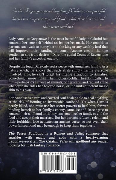 In the Regency-inspired kingdom of Calatini, two powerful houses nurse a generations-old feud... while their heirs conceal their secret soulbond. Lady Annalise Greysnowe is the most beautiful lady in Calatini, but conceals her true self behind an ice-perfect mask. Her ambitious parents can't wait to marry her to the king or any wealthy lord that will improve their standing at court. Anyone except the one gentleman she truly desires-Dare, the genial Count of Ravenstone and her family's ancestral enemy. Despite the feud, Dare only seeks peace with Annalise's family. As a nature witch, he knows that such strife simply harms everyone involved. Plus, he can't forget his intense attraction to Annalise. Something more than her otherworldly beauty calls to him-perhaps it's her love of animals, or her warm and radiant smile whenever she rides her beloved horse, or the hints of potent magic akin to his own. For Annalise is a rare and coveted soul healer able to heal anything at the risk of forming an irrevocable soulbond. Yet when Dare is nearly killed, she must use her secret powers to heal him, forever binding herself to her family's enemy. Annalise and Dare agree to conceal their soulbond until they can convince her family to end the feud and accept their marriage. But her parents refuse to relent, and their forbidden love activates an ancient curse, so not even their powerful soulbond may be enough to keep them together... The Secret Soulbond is a Romeo and Juliet romance that sparkles with magic and ends with a heartwarming happily-ever-after. The Calatini Tales will spellbind any reader looking for lush fantasy romance.