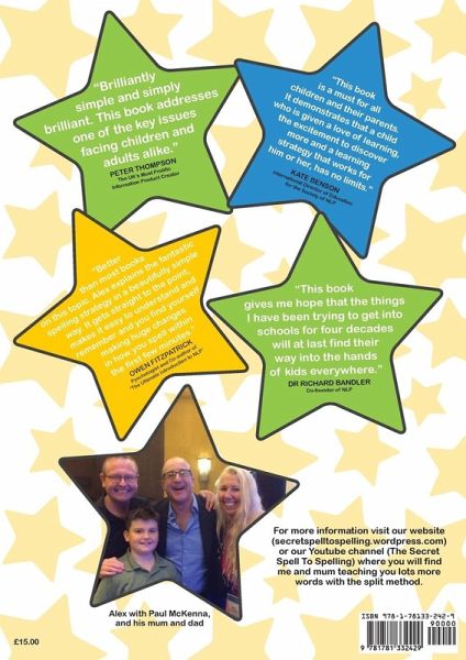The Secret Spell To Spelling teaches a visual spelling strategy called "the split method" that enables you to spell any word of your choice. Imagine being able to take photos of all the correctly spelled words into a test with you. You could just copy the words and get the answers right. This method allows you to do just that. Alex says: "This book tells you about the split method. I call it the split method because you split the word into two, three or four parts depending on how long the word is. My mum is an NLP trainer and she taught me this when I was seven. She learned this method from Dr Richard Bandler. This method is perfect for your children or yourself!"