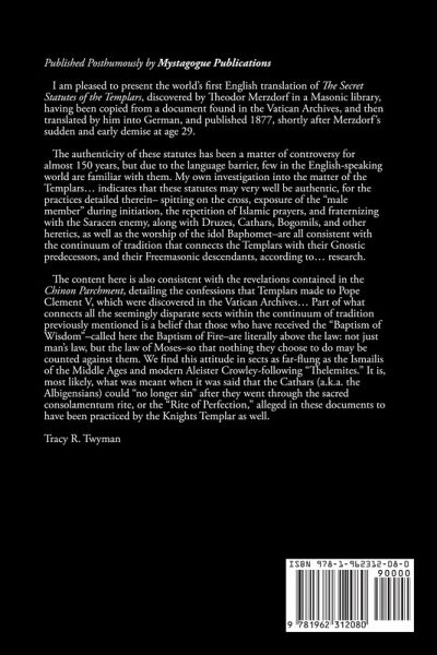 Secret Statutes of the Templars Translated to English Published Posthumously by Mystagogue Publications "I am pleased to present the world's first English translation of The Secret Statutes of the Templars, discovered by Theodor Merzdorf in a Masonic library, having been copied from a document found in the Vatican Archives, and then translated by him into German, and published 1877, shortly after Merzdorf's sudden and early demise at age 29. The authenticity of these statutes has been a matter of controversy for almost 150 years, but due to the language barrier, few in the English-speaking world are familiar with them. My own investigation into the matter of the Templars... indicates that these statutes may very well be authentic, for the practices detailed therein- spitting on the cross, exposure of the "male member" during initiation, the repetition of Islamic prayers, and fraternizing with the Saracen enemy, along with Druzes, Cathars, Bogomils, and other heretics, as well as the worship of the idol Baphomet-are all consistent with the continuum of tradition that connects the Templars with their Gnostic predecessors, and their Freemasonic descendants, according to... research. The content here is also consistent with the revelations contained in the Chinon Parchment, detailing the confessions that Templars made to Pope Clement V, which were discovered in the Vatican Archives... Part of what connects all the seemingly disparate sects within the continuum of tradition previously mentioned is a belief that those who have received the "Baptism of Wisdom"-called here the Baptism of Fire-are literally above the law: not just man's law, but the law of Moses-so that nothing they choose to do may be counted against them. We find this attitude in sects as far-flung as the Ismailis of the Middle Ages and modern Aleister Crowley-following "Thelemites." It is, most likely, what was meant when it was said that the Cathars (a.k.a. the Albigensians) could "no longer sin" after they went through the sacred consolamentum rite, or the "Rite of Perfection," alleged in these documents to have been practiced by the Knights Templar as well." Tracy Twyman Content ¿ Introduction ¿ Monumenta ad disciplinam arcanum fratrum militia Templi descripta in archive Vaticano (Monuments to the Secret Doctrine of the Brothers of the Knighthood of the Temple, Written in the Vatican Archives) ¿ Regula pauperum commilitonum Christi templique Salomonis (Rule of the poor comrades of Christ and Solomon's temple). The already known Trecensian rule. ¿ Prologus (Preface) ¿ The Trecensian Rule (Latin and German) ¿ New additions to the rule (Latin and German) ¿ Statuta secreta (the Secret Statutes) (Latin and German) ¿ Liber consoIamenti (the book of baptism of fire) (Latin and German) ¿ Rotulus signorum arcanorum (directory of secret characters) (Latin and German) ¿ Postscript
