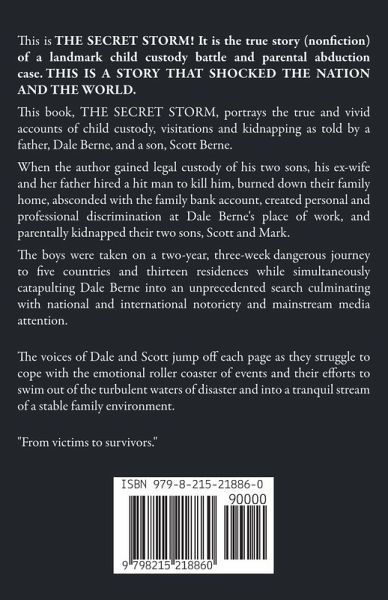 This is THE SECRET STORM! It is the true story (nonfiction) of a landmark child custody battle and parental abduction case. THIS IS A STORY THAT SHOCKED THE NATION AND THE WORLD. This book, THE SECRET STORM, portrays the true and vivid accounts of child custody, visitations and kidnapping as told by a father, Dale Berne, and a son, Scott Berne. When the author gained legal custody of his two sons, his ex-wife and her father hired a hit man to kill him, burned down their family home, absconded with the family bank account, created personal and professional discrimination at Dale Berne's place of work, and parentally kidnapped their two sons, Scott and Mark. The boys were taken on a two-year, three-week dangerous journey to five countries and thirteen residences while simultaneously catapulting Dale Berne into an unprecedented search culminating with national and international notoriety and mainstream media attention. The voices of Dale and Scott jump off each page as they struggle to cope with the emotional roller coaster of events and their efforts to swim out of the turbulent waters of disaster and into a tranquil stream of a stable family environment. "From victims to survivors."