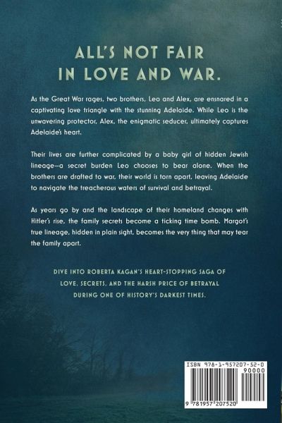All's not fair in love and war. As the Great War rages, two brothers, Leo and Alex, are ensnared in a captivating love triangle with the stunning Adelaide. While Leo is the unwavering protector, Alex, the enigmatic seducer, ultimately captures Adelaide's heart. Their lives are further complicated by a baby girl of hidden Jewish lineage-a secret burden Leo chooses to bear alone. When the brothers are drafted to war, their world is torn apart, leaving Adelaide to navigate the treacherous waters of survival and betrayal. As years go by and the landscape of their homeland changes with Hitler's rise, the family secrets become a ticking time bomb. Margot's true lineage, hidden in plain sight, becomes the very thing that may tear the family apart. Dive into Roberta Kagan's heart-stopping saga of love, secrets, and the harsh price of betrayal during one of history's darkest times.