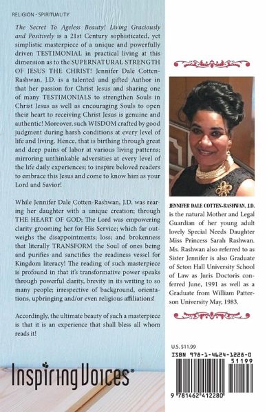The Secret To Ageless Beauty! Living Graciously and Positively is a 21st Century sophisticated, yet simplistic masterpiece of a unique and powerfully driven TESTIMONIAL in practical living at this dimension as to the SUPERNATURAL STRENGTH OF JESUS THE CHRIST! Jennifer Dale Cotten-Rashwan, J.D. is a talented and gifted Author in that her passion for Christ Jesus and sharing one of many TESTIMONIALS to strengthen Souls in Christ Jesus as well as encouraging Souls to open their heart to receiving Christ Jesus is genuine and authentic! Moreover, such WISDOM crafted by good judgment during harsh conditions at every level of life and living. Hence, that is birthing through great and deep pains of labor at various living patterns; mirroring unthinkable adversities at every level of the life daily experiences; to inspire beloved readers to embrace this Jesus and come to know him as your Lord and Savior! While Jennifer Dale Cotten-Rashwan, J.D. was rearing her daughter with a unique creation; through THE HEART OF GOD; The Lord was empowering clarity grooming her for His Service; which far outweighs the disappointments; loss; and brokenness that literally TRANSFORM the Soul of ones being and purifies and sanctifies the readiness vessel for Kingdom literacy! The reading of such masterpiece is profound in that its transformative power speaks through powerful clarity, brevity in its writing to so many people; irrespective of background, orientations, upbringing and/or even religious affiliations! Accordingly, the ultimate beauty of such a masterpiece is that it is an experience that shall bless all whom reads it!