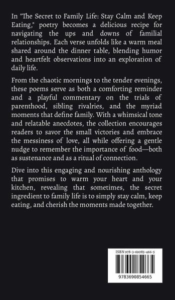 In "The Secret to Family Life: Stay Calm and Keep Eating," poetry becomes a delicious recipe for navigating the ups and downs of familial relationships. Each verse unfolds like a warm meal shared around the dinner table, blending humor and heartfelt observations into an exploration of daily life. From the chaotic mornings to the tender evenings, these poems serve as both a comforting reminder and a playful commentary on the trials of parenthood, sibling rivalries, and the myriad moments that define family. With a whimsical tone and relatable anecdotes, the collection encourages readers to savor the small victories and embrace the messiness of love, all while offering a gentle nudge to remember the importance of food-both as sustenance and as a ritual of connection. Dive into this engaging and nourishing anthology that promises to warm your heart and your kitchen, revealing that sometimes, the secret ingredient to family life is to simply stay calm, keep eating, and cherish the moments made together.