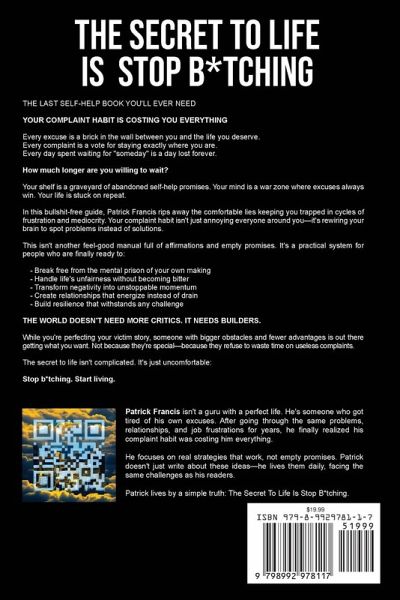 THE SECRET TO LIFE IS STOP B*TCHING Are You Tired of Watching Other People Win While You Stay Stuck? WARNING: This book isn't for everyone. It's for people ready to hear the brutal truth about why they're not getting what they want in life. Every day you spend complaining is another day successful people spend building the life you wish you had. The difference isn't luck-it's mindset. When you apply this proven philosophy, readers report immediate changes: ¿ Within days: Problems transform into possibilities you can act on ¿ Within weeks: Your energy doubles as the victim mentality disappears ¿ Within months: People wonder what happened to the old you (in the best way possible) The hard truth? Your circumstances aren't the problem. Your response to them is. While everyone else wastes time pointing fingers and making excuses, you'll learn the exact 3-step method successful people use to transform challenges into stepping stones-no complicated psychology, just battle-tested tools that create results fast. Inside these pages, you'll discover: ¿ The surprisingly simple mind shift that eliminates 90% of life's frustrations ¿ How to stop emotional vampires from draining your mental energy ¿ The "Unfair Advantage Method" for turning setbacks into comebacks ¿ Why taking radical responsibility is the ultimate power move ¿The exact scripts to use when facing difficult people or situations ¿ A proven framework for breaking the complain-fail-repeat cycle Life isn't getting any easier. The question is: will you waste another year making excuses, or finally join the people who get what they want? One decision changes everything.