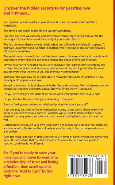 Uncover the hidden secrets to long-lasting love and intimacy... You opened up your heart and gave it your all - raw, exposed, and completely vulnerable. This time it was worth it, this time it was for everything. But then the trust was broken, and now you're wondering if things will ever be the same again. I mean how could they be right, you trusted them! This is a common theme among relationships and although avoidable, it happens. To maintain unwavering and full trust in another over a lifetime of relationship requires effort and commitment. The good news is, even if the trust has been broken this same effort and commitment can restore everything and can even enhance the bonds of love and intimacy. Did you know that over 20% of couples who have experienced broken trust repair their relationship and move forward into unconditional love? A number that would be even higher if the same study hadn't shown that in 55% of such occurrences one individual immediately gave up on their significant other... Maybe your partner cheated on you with someone else? Maybe they repeatedly fail to listen to your wants and desires, or maybe they did something that directly went against everything the two of you had previously agreed upon? Whatever the case may be, it is possible to move past this moment and into a new paradigm of happiness and love. In How To Save Your Marriage When Trust Is Broken you'll discover: ¿ The most important 1st step in building any relationship ¿ Insight from more than 15 couples who have repaired the trust in their relationship ¿ The most common trends among failing relationships and how to avoid them ¿ Expert insight on how to love yourself and why it's so important for your relationships ¿ A play by play guide to truly understanding your spouse's point of view ¿ The 5 most important things to avoid in order to maintain a long-lasting relationship ¿ What unconditional love is and how it will change your life forever ... and so much more. In The Perfect Relationship Anxiety Workbook for Married Couples, you will discover: ¿ How you and your partner can join forces to combat the anxiety ¿ What can trigger irrational behavior ¿ 7 common mistakes that can ruin your communication and your love life ¿ How to grow mutual understanding in your relationship ¿ Most common causes of conflict between couples ¿ Why your upbringing may be to blame for your relationship anxiety ¿ Whether disagreements help or harm you - and why And much more. So, if you're ready to save your marriage and move forward into a relationship of trust and loving affection, then scroll up and click the "Add to Cart" button right now.