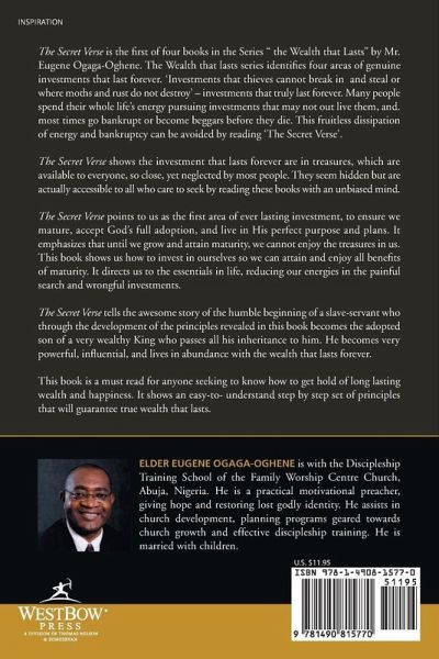 The Secret Verse is the first of four books in the Series " the Wealth that Lasts" by Mr. Eugene Ogaga-Oghene. The Wealth that lasts series identifies four areas of genuine investments that last forever. 'Investments that thieves cannot break in and steal or where moths and rust do not destroy' - investments that truly last forever. Many people spend their whole life's energy pursuing investments that may not out live them, and. most times go bankrupt or become beggars before they die. This fruitless dissipation of energy and bankruptcy can be avoided by reading 'The Secret Verse'. The Secret Verse shows the investment that lasts forever are in treasures, which are available to everyone, so close, yet neglected by most people. They seem hidden but are actually accessible to all who care to seek by reading these books with an unbiased mind. The Secret Verse points to us as the first area of ever lasting investment, to ensure we mature, accept God's full adoption, and live in His perfect purpose and plans. It emphasizes that until we grow and attain maturity, we cannot enjoy the treasures in us. This book shows us how to invest in ourselves so we can attain and enjoy all benefits of maturity. It directs us to the essentials in life, reducing our energies in the painful search and wrongful investments. The Secret Verse tells the awesome story of the humble beginning of a slave-servant who through the development of the principles revealed in this book becomes the adopted son of a very wealthy King who passes all his inheritance to him. He becomes very powerful, influential, and lives in abundance with the wealth that lasts forever. This book is a must read for anyone seeking to know how to get hold of long lasting wealth and happiness. It shows an easy-to- understand step by step set of principles that will guarantee true wealth that lasts.