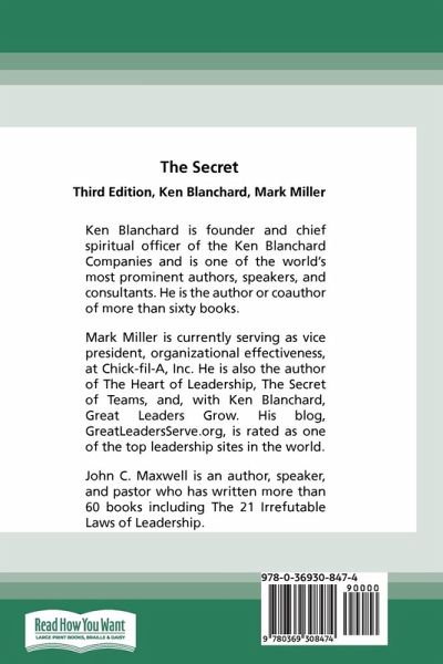 In this new edition of their classic business fable, Ken Blanchard and Mark Miller get at the heart of what makes a leader successful. Newly promoted but struggling young executive Debbie Brewster asks her mentor the one question she desperately needs answered: ''What is the secret of great leaders?'' His reply - ''great leaders serve'' - flummoxes her, but over time he reveals the five fundamental ways that leaders succeed through service. Along the way she learns: â¿¢ Why great leaders seem preoccupied with the future â¿¢ How people on the team ultimately determine your success or failure â¿¢ What three arenas require continuous improvement â¿¢ Why true success in leadership has two essential components â¿¢ How to knowingly strengthen - or unwittingly destroy - leadership credibility. The tenth anniversary edition includes a leadership self - assessment so readers can measure to what extent they lead by serving and where they can improve. The authors also have added answers to the most frequently asked questions about how to apply the SERVE model in the real world. As practical as it is uplifting, The Secret shares Blanchard's and Miller's wisdom about leadership in a form that anyone can easily understand and implement. This book will benefit not only those who read it but also the people who look to them for guidance and the organizations they serve.