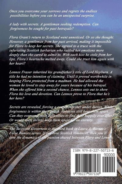 Once you overcome your sorrows and regrets the endless possibilities before you can be an unexpected surprise. A lady with secrets. A gentleman seeking redemption. Can forgiveness be sought for past betrayals? Flora Grant's return to Scotland went unnoticed. Or so she thought. However, a gentleman from her past arrived, making it impossible for Flora to keep her secrets. She agreed to a truce with the infuriating Scottish barbarian who rattled her emotions more deeply than she cared to admit to. With each kiss he stole from her lips, Flora's heartache melted away. Could she trust him again with her heart? Lennox Fraser inherited his grandfather's title of Lord Hepburn. A title he had no intention of claiming. Until it proved worthwhile in keeping Flora protected from a madman. He had allowed the woman he loved to stay away for years because of his betrayal. When she offered him a second chance, Lennox sets out to show Flora his love and devotion. Can Lennox prove to Flora that he's her hero? Secrets are revealed, forcing a couple together under duress. While forgiveness is within their grasp, obstacles still keep them apart. Can they overcome their difficulties to find their happily ever after? Or would their secrets keep them apart for an eternity. The Secretive Governess is the third book in Laura A. Barnes's False Rumors series. If you love Scottish romances, then you'll love the dynamics of the passion shared between Flora and Lennox. Spoil yourself with The Secretive Governess
