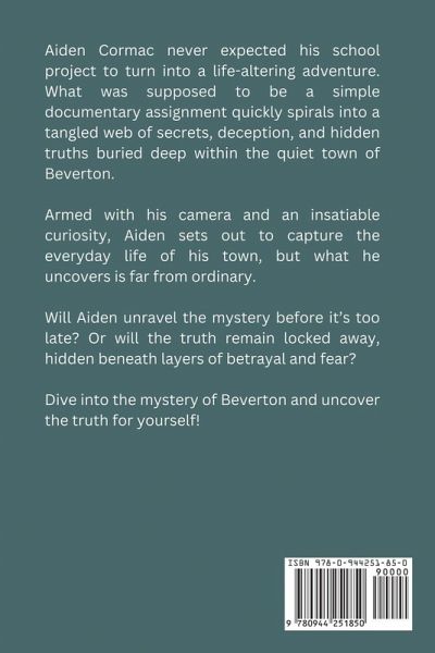 Aiden Cormac never expected his school project to turn into a life-altering adventure. What was supposed to be a simple documentary assignment quickly spirals into a tangled web of secrets, deception, and hidden truths buried deep within the quiet town of Beverton. Armed with his camera and an insatiable curiosity, Aiden sets out to capture the everyday life of his town, but what he uncovers is far from ordinary. Strange disappearances, cryptic messages, and whispers of a mystery long forgotten pull him into a thrilling chase for answers. As he digs deeper, Aiden realizes that not everyone wants the past to resurface-and some would go to great lengths to keep it buried. With every clue he uncovers, Aiden finds himself questioning who he can trust. Friendships are tested, loyalties are shattered, and danger lurks around every corner. The deeper he goes, the more he risks-his friendships, his safety, and maybe even his life. Will Aiden unravel the mystery before it's too late? Or will the truth remain locked away, hidden beneath layers of betrayal and fear? A gripping tale of suspense, unexpected twists, and the courage to seek the truth-this novel will keep you turning pages late into the night. Dive into the mystery of Beverton and uncover the truth for yourself!