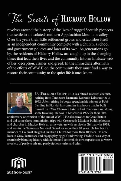 The Secrets of Hickory Hollow revolves around the history of the lives of rugged Scottish pioneers that settle in an isolated southern Appalachian Mountain valley. Over the years their little settlement grows and establishes itself as an independent community complete with a church, a school, and government policies and laws of its own. As generations go by, the residents of Hickory Hollow are caught up in the changing times that lead their lives and the community into an intricate web of lies, deception, crimes and greed. In the immediate aftermath of the effects of WW II on the community they must find a way to restore their community to the quiet life it once knew.
