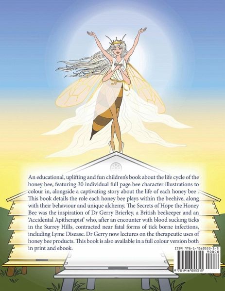 Based on the award winning book- The Secrets of Hope The Honey Bee. This colouring in book has the same enchanting, fun and educational story about the life cycle of the honey bee included, along with 30 honey bee characters and 30 beautiful large illustrations in black and white for children or adults to colour in. This unique colouring book provides the opportunity to colour in the characters, from Eve the Egg; Luna the Larva; Pippa the Pupa; Bluebell the Beeswax Bee, to Adam the Egg; Duke the King Drone Bee; Prospera the Princess Bee; Queenie the Queen Bee; Betty the Beekeeper and many more! Written in the first person, with a rhyming tone, each little bee introduces themselves and tells the child a secret, these secrets are scientific facts about the jobs which the bee does in the beehive at a specific stage within their life cycle. The book culminates into a beautiful poem incorporating each character. The Secrets of Hope the Honey Bee was the inspiration of Dr Gerry Brierley, a British beekeeper and an 'Accidental Apitherapist' who, after an encounter with blood sucking ticks in the Surrey Hills, contracted near fatal forms of tick borne infections, including Lyme Disease. Dr Gerry now lectures on the subject of Medicinal Apitherapy, including the therapeutic uses of bee venom. This book is not just a story about the honey bees; it is about a struggle for survival and winning through in the face of immense adversity. Hope is the spirit of the honey bee who is sending a message to the world. As the title suggests, this book is about never ending 'Hope'.