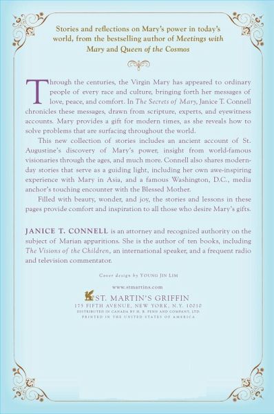 Through the centuries, the Virgin Mary has appeared to ordinary people of every race and culture, bringing forth her messages of love, peace, and comfort. In these trying times, Mary's protection is needed more than ever. In The Secrets of Mary, Janice T. Connell chronicles messages Mary has brought from God, drawn from scripture, experts, and eyewitness accounts. Mary's voice provides a guiding light for modern times, as she explains how to solve problems that are surfacing throughout the world. Janice T. Connell's newest collection of stories includes: . Saint Augustine's discovery of Mary's power . Insight from the world-famous children of Medjugorje in Bosnia . A famous Washington, D.C. media anchor's touching encounter with the Blessed Mother . The author's own awe-inspiring experience with Mary in Japan . And much more. Filled with beauty, wonder, and joy, The Secrets of Mary provides comfort and inspiration to all those who desire Mary's gifts.