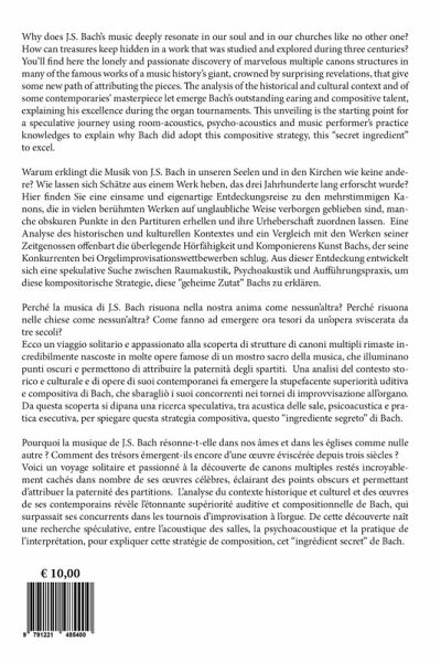 Perche¿ la musica di J.S. Bach risuona nella nostra anima e nelle chiese come nessun'altra? Come fanno ad esserci tesori ancora nascosti in un'opera studia- ta e sviscerata da tre secoli? In questo libricino (Bu¿chlein) si dipana un in- gegnoso percorso di scoperta di strutture rimaste incredibilmente nascoste in molte opere famose di un mostro sacro della storia della musica come Bach. E¿ un'avventura solitaria e appassionata che ha tracciato la vita dell'autore per decenni, premiata da rivelazioni sorprendenti, che illuminano punti oscuri di alcuni spartiti, oggetto di dispute musicali, o che permettono di completare pezzi mancanti o abbozzati di altri spartiti, o di attribuirne la paternitä. Dopo una analisi leggera del contesto storico e culturale ed un confronto con opere di altri musicisti della sua epoca, emerge la stupefacente capacitä uditiva e compositiva di Bach, che sbaraglia acusticamente gli altri compositori di tutti i tempi, come sbaraglio¿ i suoi concorrenti nei tornei di improvvisazione all'organo. La scoperta delle meravigliose strutture di canone multiplo e¿ la base della ricerca speculativa della seconda parte del testo, tra acustica delle sale, psicoacustica e pratica esecutiva, volta a spiegare perche¿ Bach abbia adottato questa strategia compositiva, questo "ingrediente segreto" di successo.verborgene mehrstimmige Kanons - canons multiples cachés -
