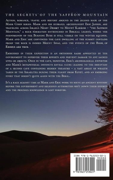 Action, romance, travel and history abound in the second book of the Mark Cohn series. Mark and his husband, archeologist Eric Jansen, are traveling across Israel's Negev Desert to Mount Karkom-"the Saffron Mountain," a rock formation entrenched in Biblical legend, where the phenomenon of the Burning Bush is still visible on the winter equinox. Mark and Eric are convinced the cave dwelling at the summit contains proof the rock is indeed Mount Sinai, and the events of the Book of Exodus are true. Embedded in their expedition is an orthodox rabbi appointed by the government to supervise their efforts and prevent damage to any sacred sites or objects. Once in the cave, however, Eric's archeological expertise and Mark's metaphysical instincts reveal clues leading to the discovery of a second cave containing hidden treasure-a vast array of wealth taken by the Israelites during their flight from Egypt, and an emerging story that doesn't quite align with the Bible... It's a race against time as Mark and Eric work to solve an ancient mystery before the government and religious authorities shut down their efforts and the precious knowledge is lost forever.