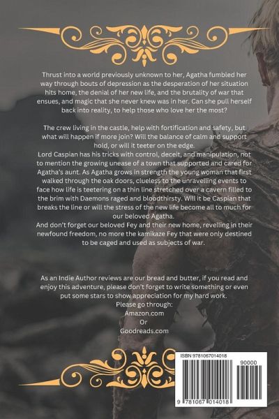 Thrust into a world previously unknown to her, Agatha fumbled her way through bouts of depression as the desperation of her situation hits home, the denial of her new life, and the brutality of war that ensues, and magic that she never knew was in her. Can she pull herself back into reality, to help those who love her the most? The crew living in the castle, help with fortification and safety, but what will happen if more join? Will the balance of calm and support hold, or will it teeter on the edge. Lord Caspian has his tricks with control, deceit, and manipulation, not to mention the growing unease of a town that supported and cared for Agatha's aunt. As Agatha grows in strength the young woman that first walked through the oak doors, clueless to the unravelling events to face how life is teetering on a thin line stretched over a cavern filled to the brim with Daemons raged and bloodthirsty. Will it be Caspian that breaks the line or will the stress of the new life become all to much for our beloved Agatha. And don't forget our beloved Fey and their new home, revelling in their newfound freedom, no more the kamikaze Fey that were only destined to be caged and used as subjects of war.