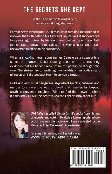 In the Land of the Midnight Sun, secrets cast long shadows. Former Army investigator Duke McAllister remains determined to uncover the truth behind his fiancée's mysterious disappearance two years ago. Joined by his friend and podcast teammate, Andi Slade, Duke delves into Celeste Dawson's past and soon uncovers a mind-bending conspiracy. When a shocking news report names Celeste as a suspect in a series of murders, Duke must grapple with the mounting evidence that his fiancée may not be the person he thought she was. The stakes rise to terrifying new heights when bodies start piling up and the podcast team becomes a target. Duke and Andi must navigate a labyrinth of secrets, betrayal, and murder to unravel the web of deceit that reaches far beyond anything they ever imagined. Will they find the answers before it's too late? Or will the secrets Celeste kept destroy them all?