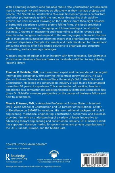 Thomas C. Schleifer, PhD, is a turnaround expert and the founder of the largest international consultancy firm serving the contract surety industry. He was also an Eminent Scholar at Arizona State University's Del E. Webb School of Construction. He joined the construction industry at age 16 and has amassed more than 60 years of experience. This combination of practical, hands-on experience as a contractor and assisting financially distressed companies has given Dr. Schleifer a unique perspective on the causes of business failure and how to avoid them. Mounir El Asmar, PhD, is Associate Professor at Arizona State University's Del E. Webb School of Construction and Co-Director of the National Center of Excellence on SMART Innovations. His non-traditional background in civil engineering, mechanical engineering, construction, economics, and business, provides him with an understanding of a variety of facets imperative to advancing today's engineering and construction industry. Dr. El Asmar's work has supported decision-making for governments and private organizations in the U.S., Canada, Europe, and the Middle East.