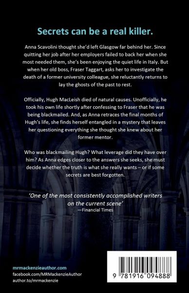 Secrets can be a real killer. Anna Scavolini thought she'd left Glasgow far behind her. Since quitting her job after her employers failed to back her when she most needed them, she's been enjoying the quiet life in Italy. But when her old boss, Fraser Taggart, asks her to investigate the death of a former university colleague, she reluctantly returns to lay the ghosts of the past to rest. Officially, Hugh MacLeish died of natural causes. Unofficially, he took his own life shortly after confessing to Fraser that he was being blackmailed. And, as Anna retraces the final months of Hugh's life, she finds herself entangled in a mystery that leaves her questioning everything she thought she knew about her former mentor. Who was blackmailing Hugh? What leverage did they have over him? As Anna edges closer to the answers she seeks, she must decide whether the truth is what she really wants - or if some secrets are best forgotten. PRAISE FOR M.R. MACKENZIE 'One of the most consistently accomplished writers on the current scene.' - Financial Times 'Mackenzie has come up with something that defies easy definition and is truly original.' - NB Magazine 'Brings a fresh new voice to the field of Tartan Noir.' - James Oswald 'Writes with precision and passion.' - Caro Ramsay 'An immersive slow burn of a tale, peppered with disquieting fire-crackers of revelation.' - Gordon J. Brown 2025 IngramSpark(R) Editorial Selection - Mystery/Thriller