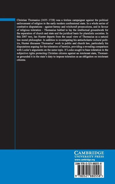 Christian Thomasius (1655–1728) was a tireless campaigner against the political enforcement of religion in the early modern confessional state. In a whole series of combative disputations - against heresy and witchraft prosecutions, and in favour of religious toleration - Thomasius battled to lay the intellectual groundwork for the separation of church and state and the juridical basis for pluralistic societies. In this first book-length study in English of Thomasius' political thought, Ian Hunter departs from the usual view of Thomasius as a natural law moral philosopher. In addition to investigating his anti-scholastic cultural politics, Hunter discusses Thomasius' work in public and church law, particularly his disputations arguing for the toleration of heretics, providing a revealing comparison with Locke's arguments on the same topic. If Locke sought to base toleration in the subjective rights protecting Christian citizens against an intolerant state, Thomasius grounded it in the state's duty to impose toleration as an obligation on intolerant citizens.