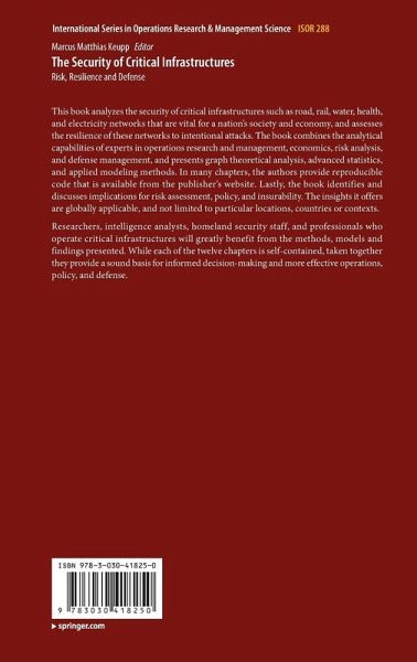 This book analyzes the security of critical infrastructures such as road, rail, water, health, and electricity networks that are vital for a nation's society and economy, and assesses the resilience of these networks to intentional attacks. The book combines the analytical capabilities of experts in operations research and management, economics, risk analysis, and defense management, and presents graph theoretical analysis, advanced statistics, and applied modeling methods. In many chapters, the authors provide reproducible code that is available from the publisher's website. Lastly, the book identifies and discusses implications for risk assessment, policy, and insurability. The insights it offers are globally applicable, and not limited to particular locations, countries or contexts.