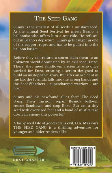 Sunny is the smallest of all seeds: a mustard seed. At the annual Seed Festival he meets Beano, a balloonist who offers him a test ride. He refuses, but in Beano's departure, Sunny gets caught in one of the support ropes and has to be pulled into the balloon basket. Before they can return, a storm takes them to an unknown world dominated by an evil seed, Enzo. There, they meet Sandtown, a scientist who once worked for Enzo, creating a serum designed to build an unstoppable army. But after an accident in the lab, the formula falls into the wrong hands and the SeedWhackers - supercharged warriors - are born. Sunny and his newfound allies form The Seed Gang. Their mission: repair Beano's balloon, rescue Sandtown, and stop Enzo. But can a tiny seed with oversized feet and a band of misfits take down an enemy this powerful? A fast-paced tale of good versus evil, D.A. Maxson's THE SEED GANG is a thrilling adventure for younger and older readers alike.