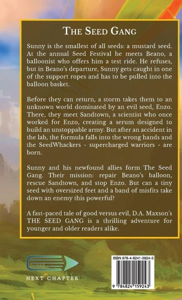 Sunny is the smallest of all seeds: a mustard seed. At the annual Seed Festival he meets Beano, a balloonist who offers him a test ride. He refuses, but in Beano's departure, Sunny gets caught in one of the support ropes and has to be pulled into the balloon basket. Before they can return, a storm takes them to an unknown world dominated by an evil seed, Enzo. There, they meet Sandtown, a scientist who once worked for Enzo, creating a serum designed to build an unstoppable army. But after an accident in the lab, the formula falls into the wrong hands and the SeedWhackers - supercharged warriors - are born. Sunny and his newfound allies form The Seed Gang. Their mission: repair Beano's balloon, rescue Sandtown, and stop Enzo. But can a tiny seed with oversized feet and a band of misfits take down an enemy this powerful? A fast-paced tale of good versus evil, D.A. Maxson's THE SEED GANG is a thrilling adventure for younger and older readers alike.
