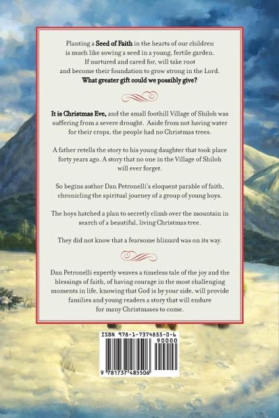 PenCraft (2023) Christian-Children Book Awards - Winner Kirkus Review : "Our Verdict - Get it!" Mom's Choice Awards: Gold Medal (2022) Moonbeam Children's Book Awards, Gold Medal: Religion/Spirituality (2021) "...may well become an enduring Christmas classic." 5 Stars ¿¿ ¿¿ ¿¿ ¿¿ ¿¿ - Home School Book Review ¿¿¿¿¿¿¿¿¿Planting a Seed of Faith in the hearts of our children is much like sowing a seed in a young, fertile garden. If nurtured and cared for, will take root and become their foundation to grow strong in the Lord. What greater gift could we possibly give? It is Christmas Eve, and the small foothill Village of Shiloh was suffering from a severe drought. Aside from not having water for their crops, the people had no Christmas trees. A father retells the story to his young daughter that took place forty years ago. A story that no one in the Village of Shiloh will ever forget. So begins author Dan Petronelli's eloquent parable of faith, chronicling the spiritual journey of a group of young boys. The boys hatched a plan to secretly climb over the mountain in search of a beautiful, living Christmas tree. They did not know that a fearsome blizzard was on its way. Dan Petronelli expertly weaves a timeless tale of the joy and the blessings of faith, of having courage in the most challenging moments in life, knowing that God is by your side, will provide families and young readers a story that will endure for many Christmases to come.