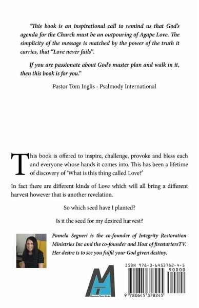 "This book is an inspirational call to remind us that God's agenda for the Church must be an outpouring of Agape Love. The simplicity of the message is matched by the power of the truth it carries, that "Love never fails". If you are passionate about God's master plan and walk in it, then this book is for you."Pastor Tom Inglis - Psalmody International. This book is offered to inspire, challenge, provoke and bless each and everyone whose hands it comes into. This has been a lifetime of discovery of 'What is this thing called Love?' In fact there are different kinds of Love which will all bring a different harvest however that is another revelation. So which seed have I planted? Is it the seed for my desired harvest? Pamela Segneri is the co-founder of Integrity Restoration Ministries Inc and the co-founder and Host of firestartersTV. Her desire is to see you fulfil your God given destiny.