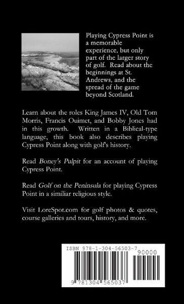 Playing Cypress Point is a memorable experience, but only part of the larger story of golf. Read about the beginnings at St. Andrews, and the spread of the game beyond Scotland. Learn about the roles King James IV, Old Tom Morris, Francis Ouimet, and Bobby Jones had in this growth, and about one family's place in this stream of events, ending with a trip to Cypress. Written in a Biblical-like style.